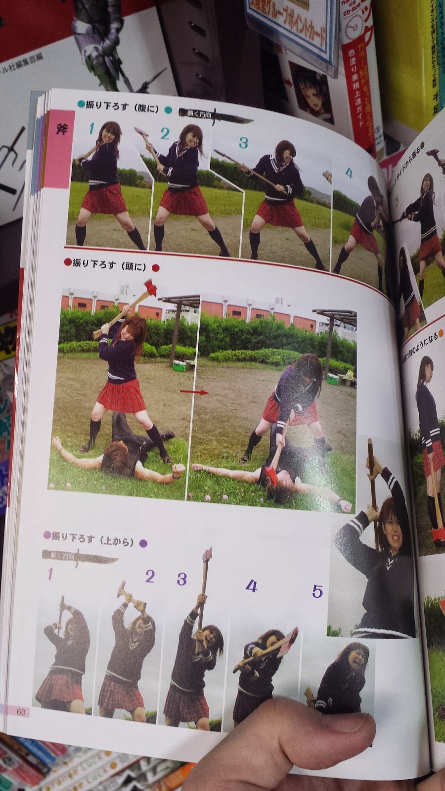 Among other stuff, I found this instructive book on how a girl should properly use an axe when attacking. This seems like it should be on the regular school curriculum, eh?...